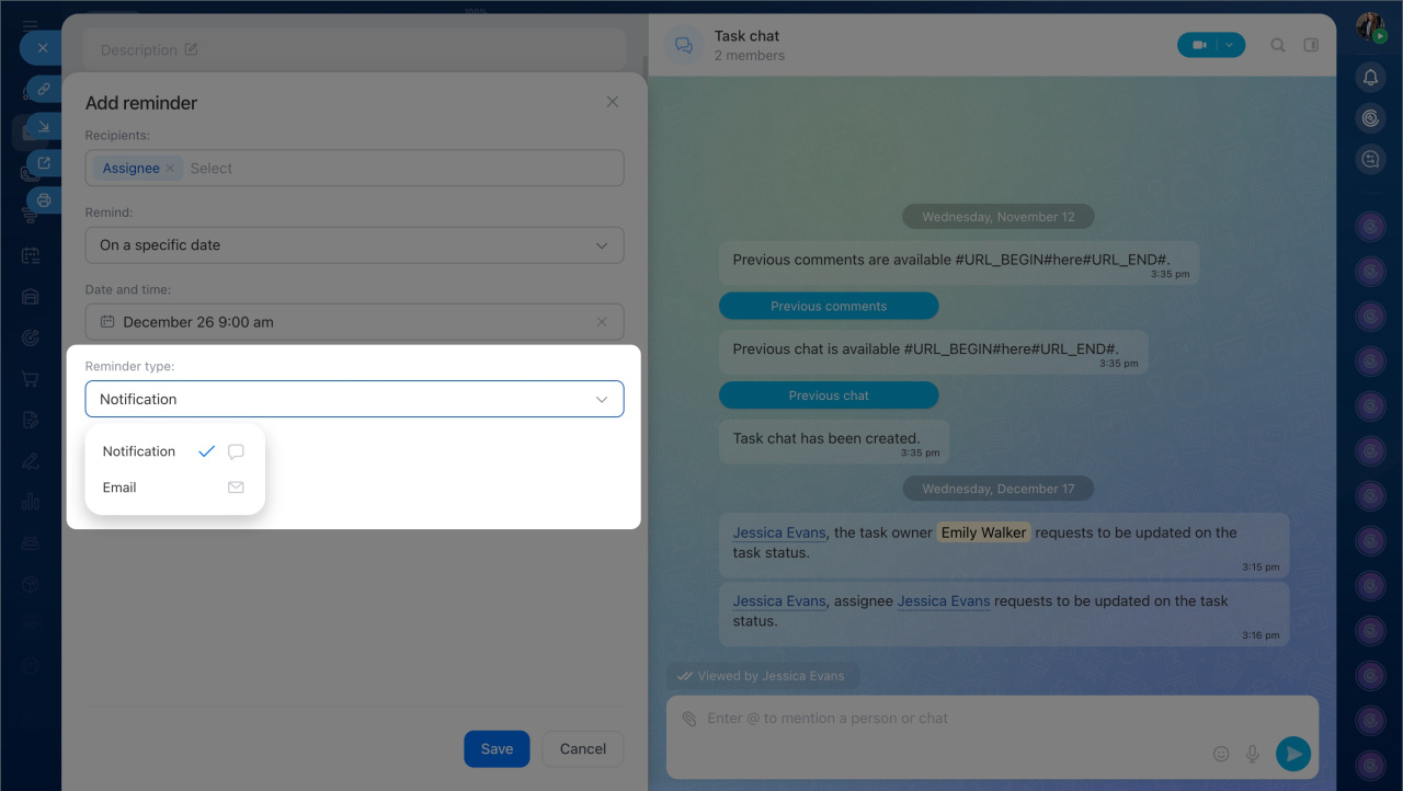 - Les rappels peuvent être envoyés sous forme de notification dans Bitrix24 ou par e-mail.