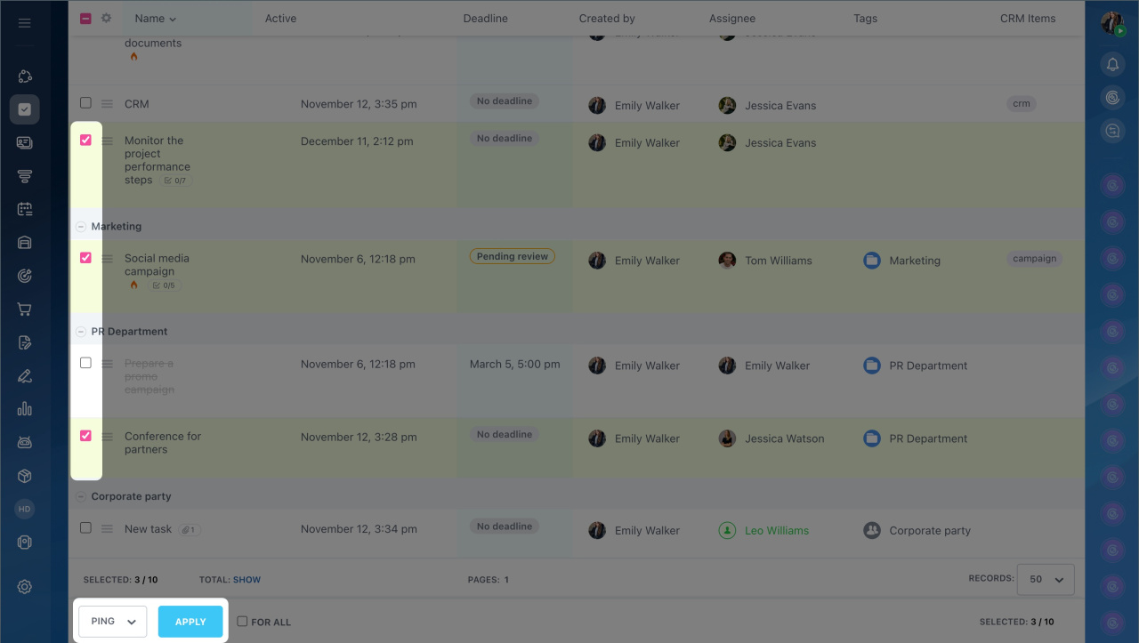 Dans la liste, sélectionnez les tâches souhaitées, puis cliquez sur Sélectionnez une action > Ping > Appliquer.