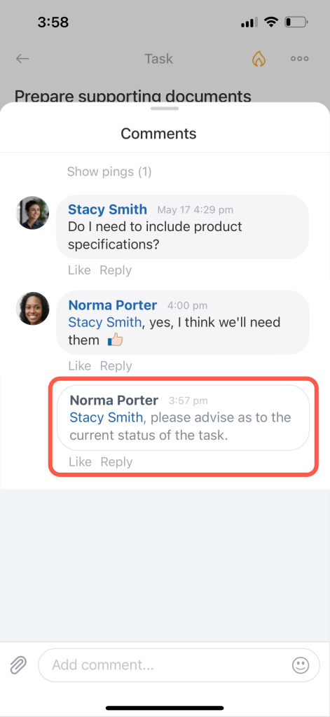 Un ping est une courte notification qui permet de savoir où en est une tâche. Vous pouvez l’envoyer au responsable ainsi qu’aux participants pour clarifier son avancement sans engager une longue discussion.