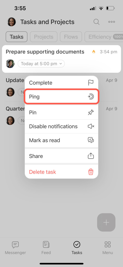 - Vous pouvez envoyer un ping depuis la liste des tâches : dans la version Web via le menu de la tâche, et dans l’application mobile en appuyant longuement sur une tâche.