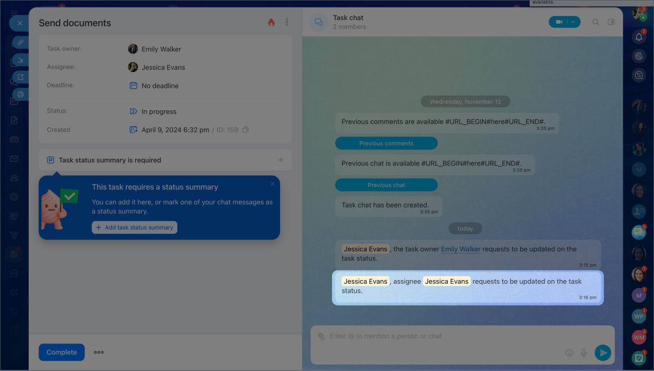 Le responsable et les participants recevront une notification indiquant que vous avez demandé des nouvelles de l’avancement de la tâche. Un message système apparaîtra également dans le chat de la tâche.