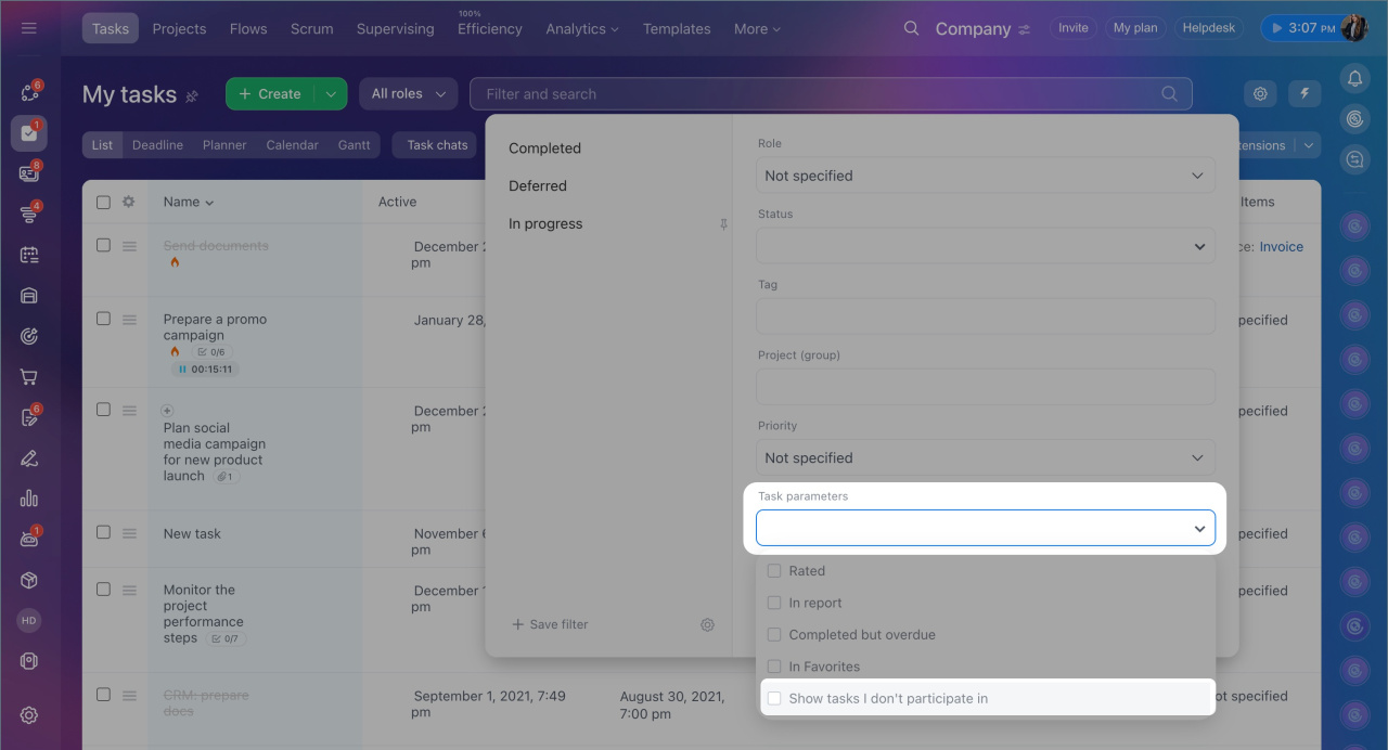 Par défaut, le filtre affiche uniquement les tâches dans lesquelles vous êtes impliqué en tant que responsable, participant, propriétaire ou observateur. Pour afficher les tâches des autres employés, ouvrez le champ Paramètres de tâche et cochez l’option Afficher les tâches auxquelles je ne participe pas :