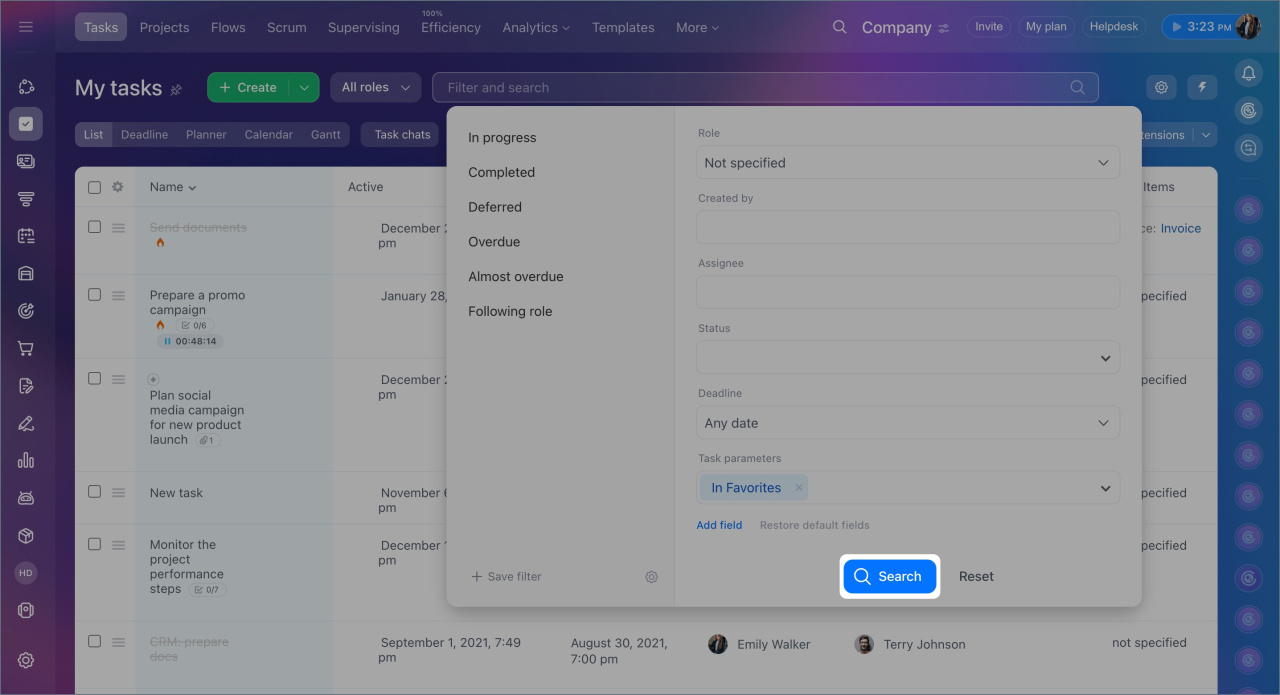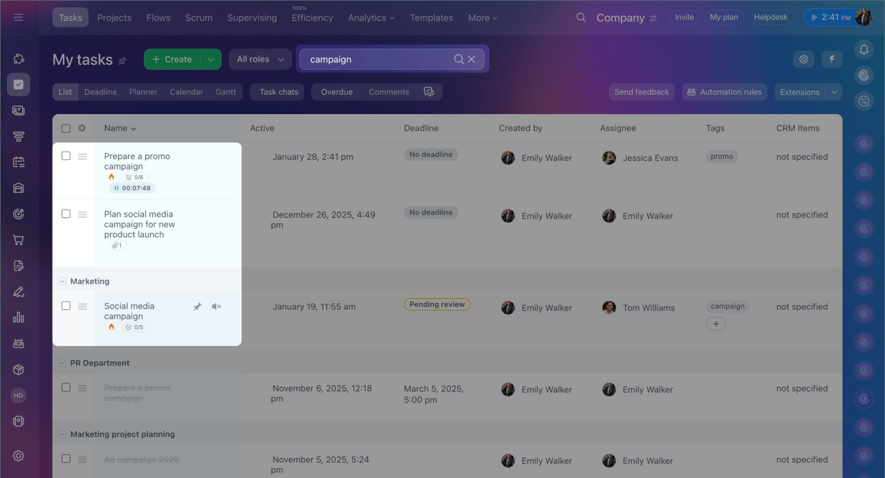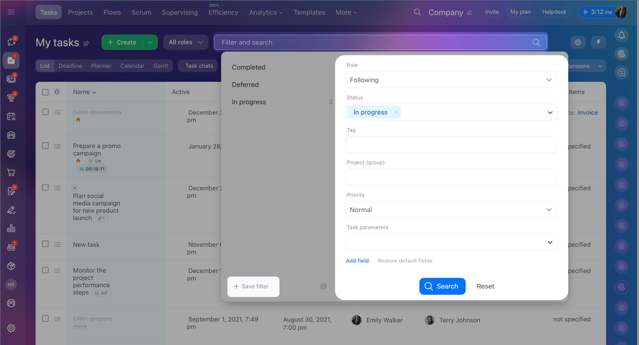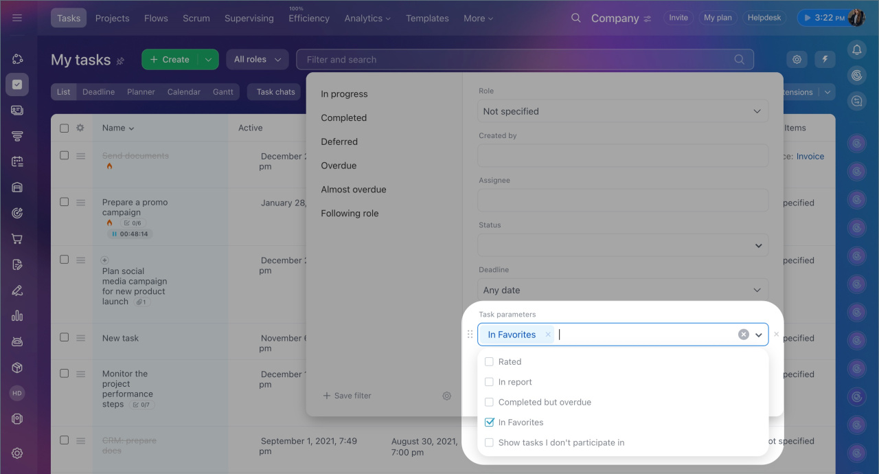 Lorsque le nombre de tâches augmente, il peut être difficile de retrouver celle dont vous avez besoin. Dans Bitrix24, la recherche intelligente et les filtres vous aident à trouver rapidement des tâches selon différents critères : responsable, statut, date limite et autres paramètres. Par exemple, vous pouvez afficher toutes les tâches prioritaires ou celles que vous avez assignées.