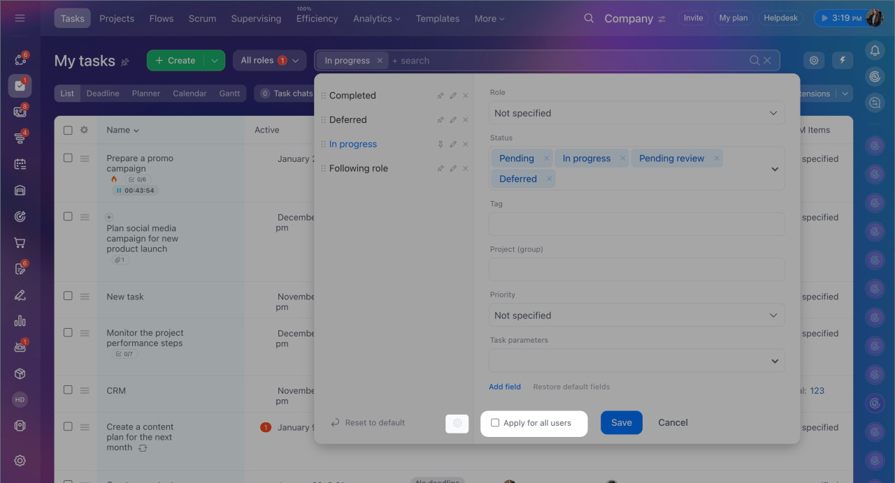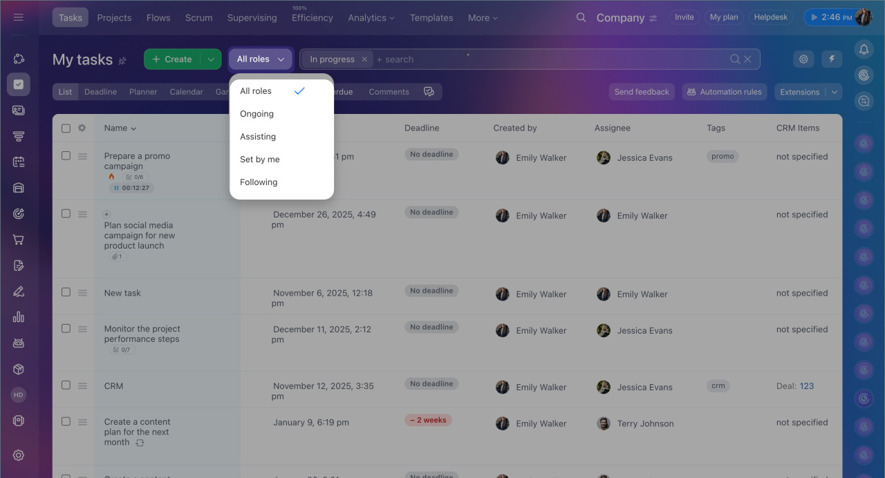 - Bitrix24 propose des filtres standards par rôle et par statut.