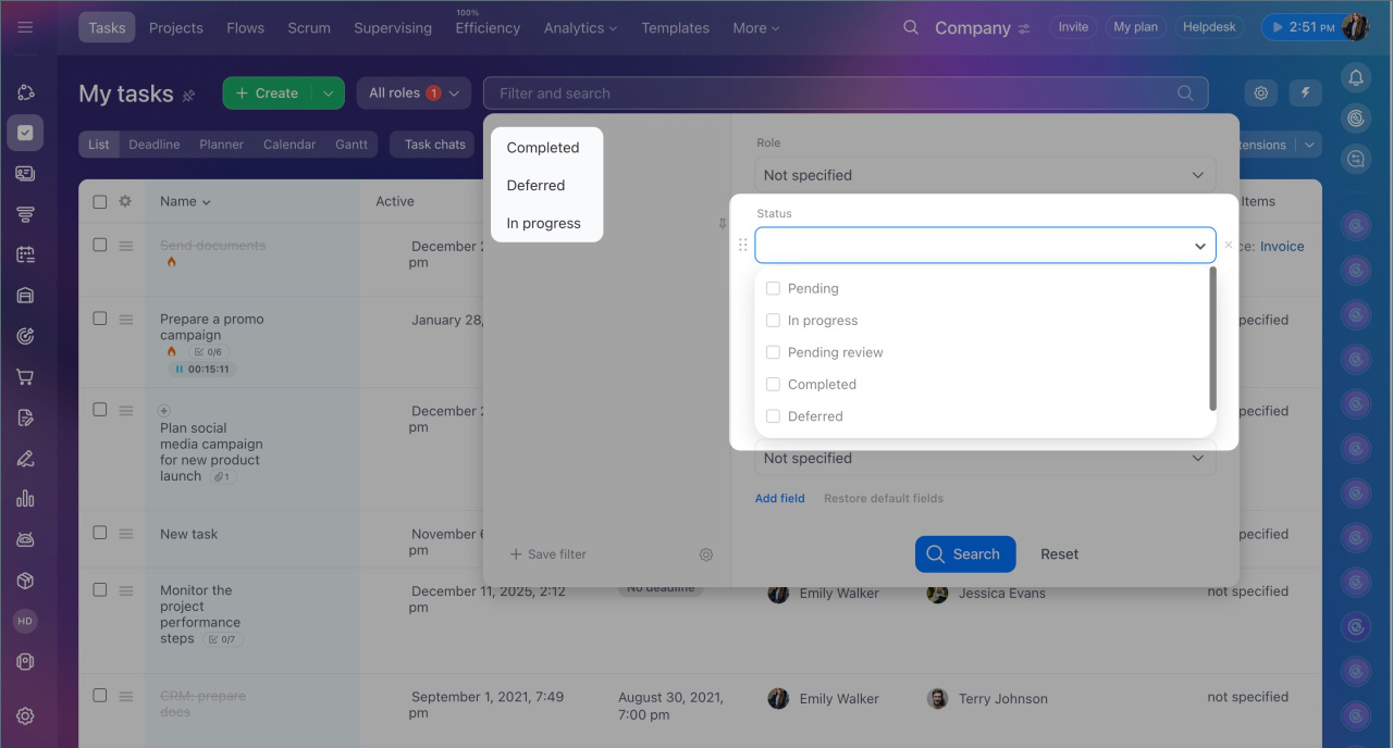 Les tâches proposent des filtres standards par rôle et par statut. Ils permettent de retrouver rapidement les tâches souhaitées sans avoir à configurer les filtres manuellement, par exemple pour afficher uniquement les tâches que vous réalisez ou que vous avez assignées.