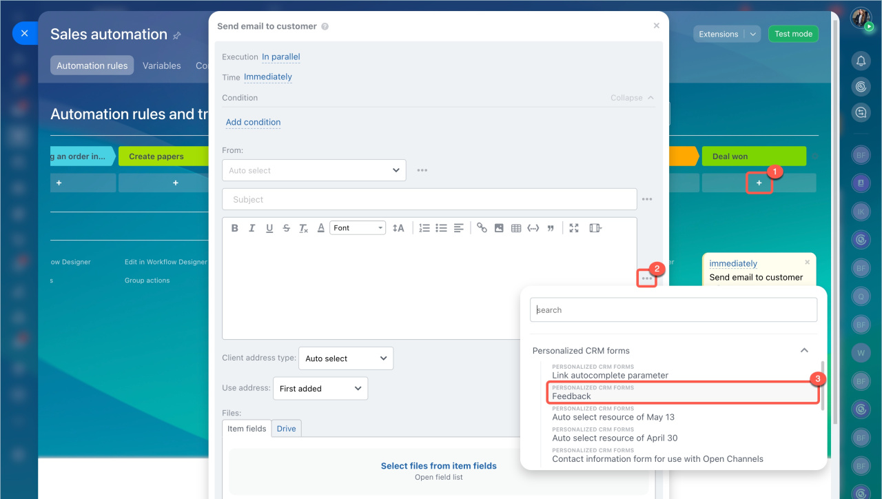 - Créez une règle d’automatisation dans le CRM pour envoyer un e-mail, un SMS ou un message. Ajoutez le lien vers le formulaire personnalisé dans le texte : cliquez sur Trois points (...) à côté du champ de texte et sélectionnez le formulaire souhaité dans la liste Formulaires CRM personnalisés.