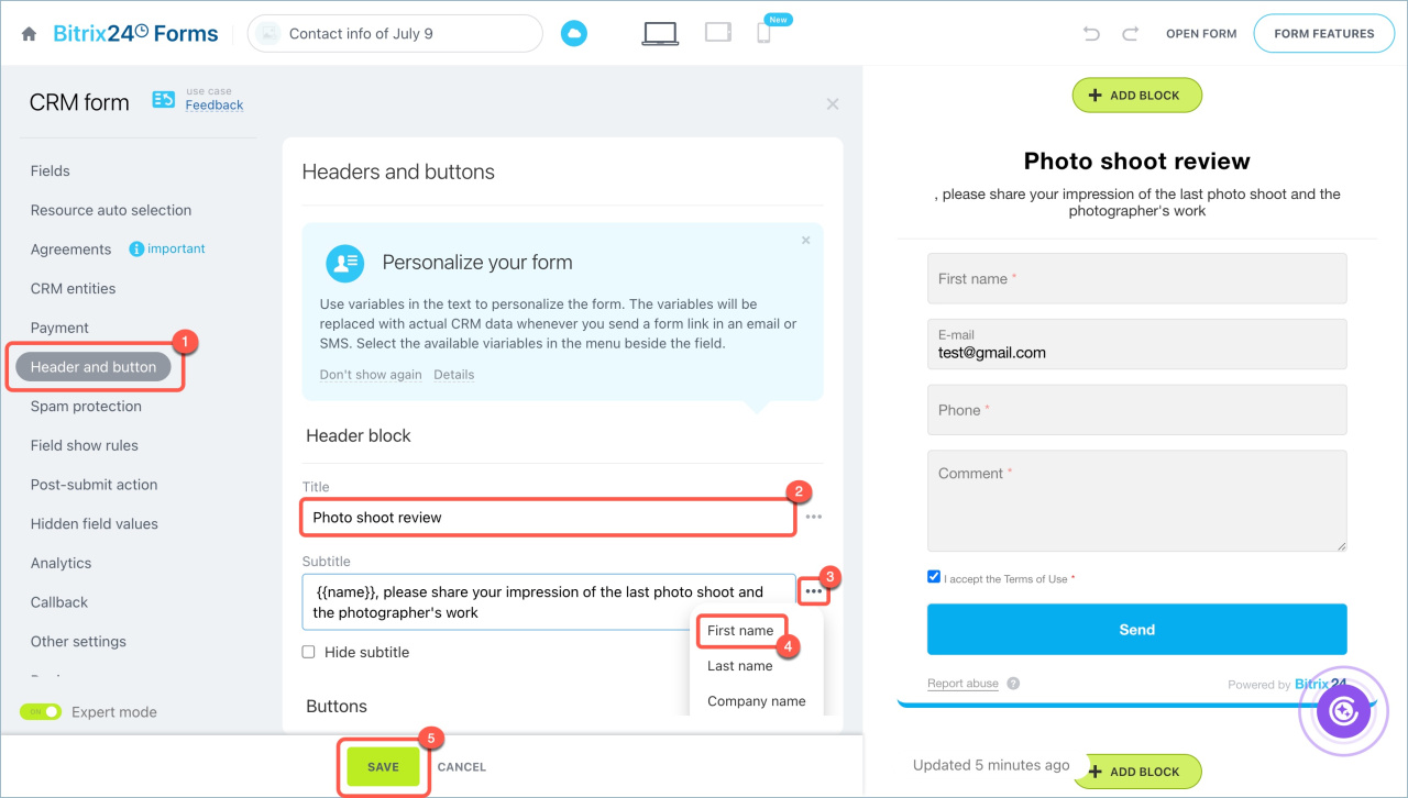 - Remplissez les champs Titre et Sous-titre. Par exemple, indiquez le nom du formulaire CRM dans le titre et demandez un avis dans le sous-titre.
