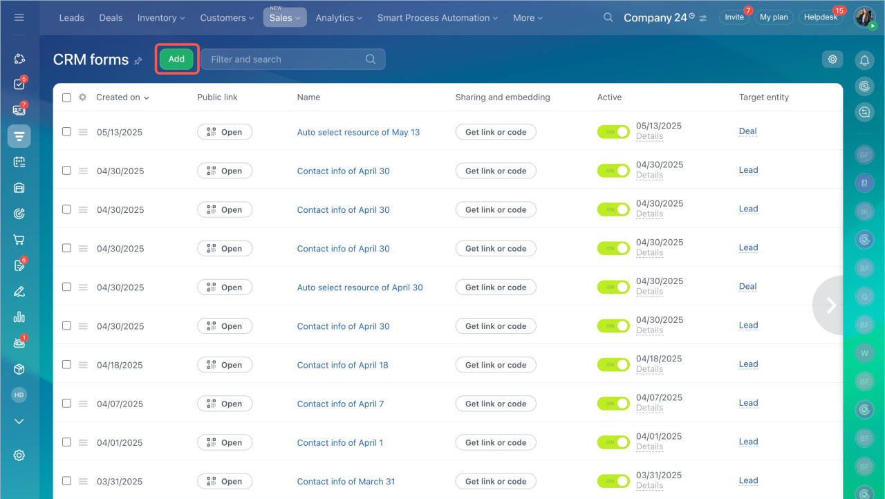 Accédez à la section CRM > Ventes > Canaux de vente > Formulaires CRM. Ouvrez le formulaire souhaité ou créez-en un nouveau.