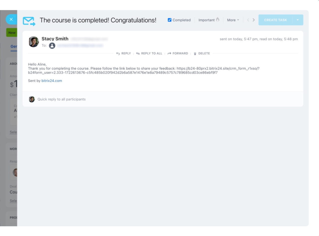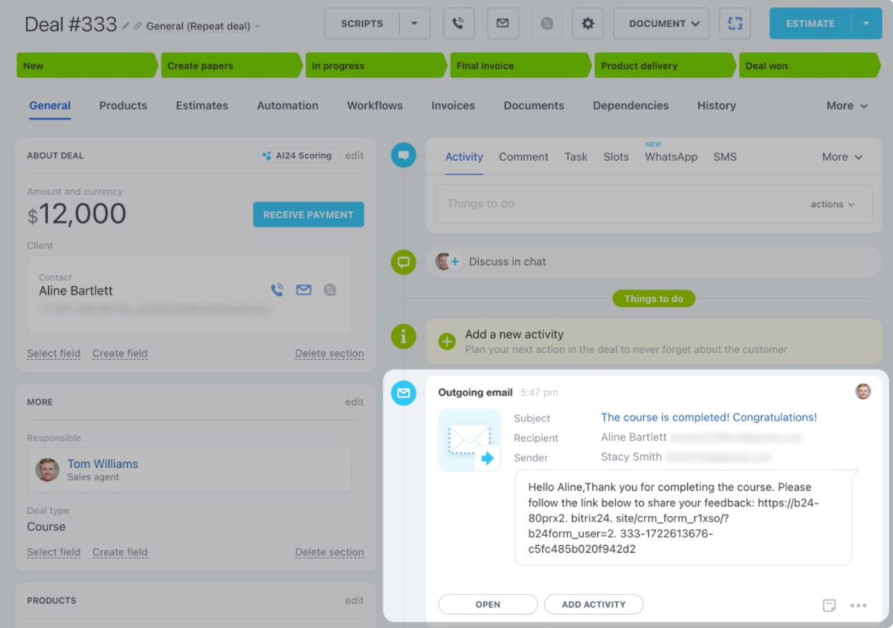 - Déplacez la transaction à l’étape où la règle d’automatisation est configurée. Un e-mail sortant apparaîtra dans la chronologie de la transaction.