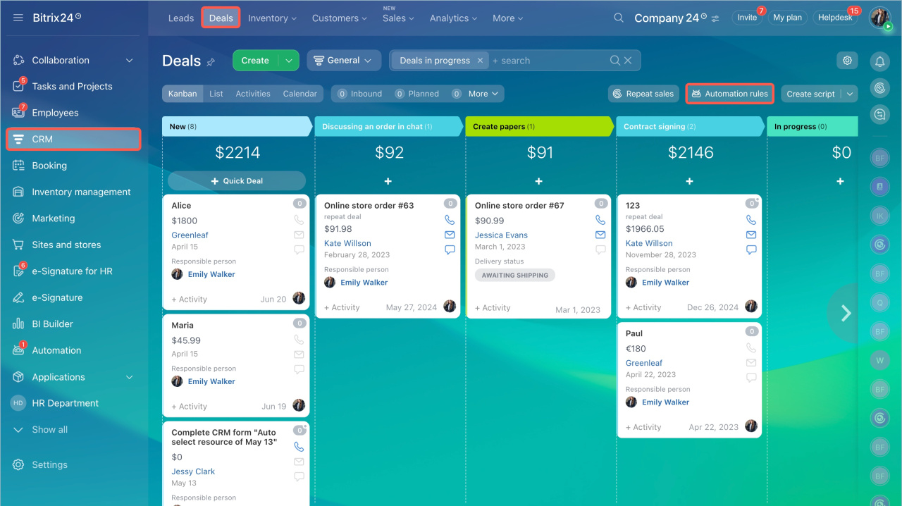 - Accédez à la section CRM > Transactions et cliquez sur Règles d'automatisation.
