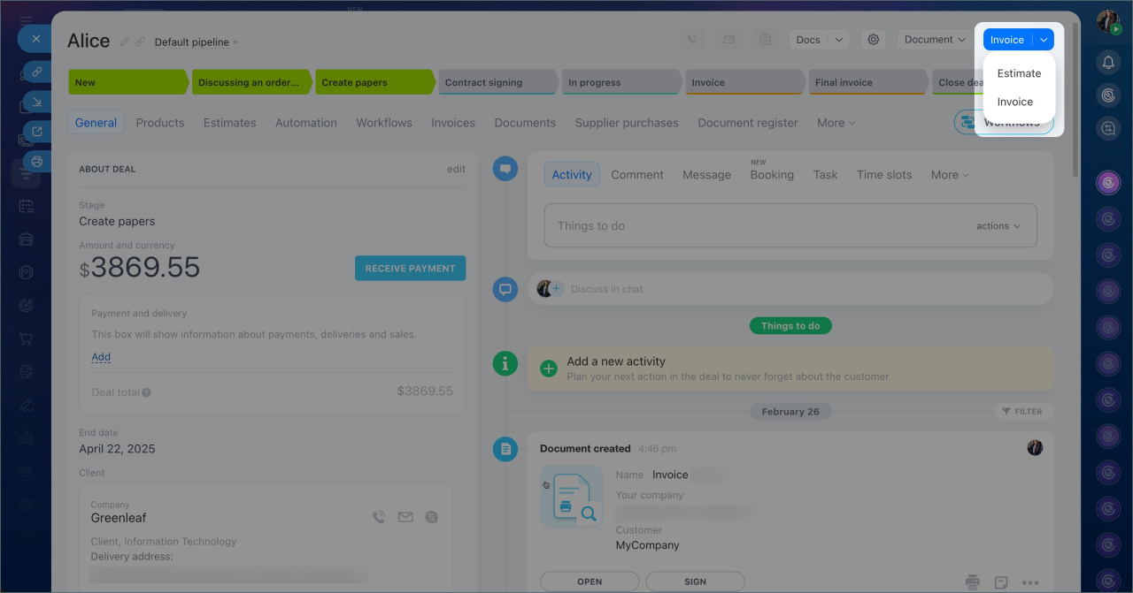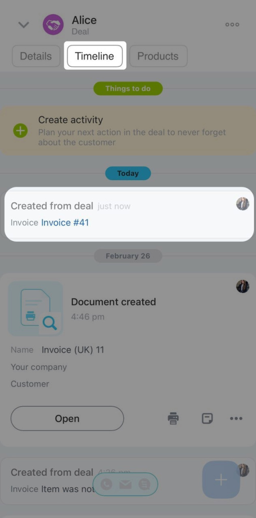 Lorsqu’un client examine un devis et est prêt à acheter, le responsable peut créer une facture à partir du devis. Le nouvel élément apparaît dans la chronologie de la fiche du devis.