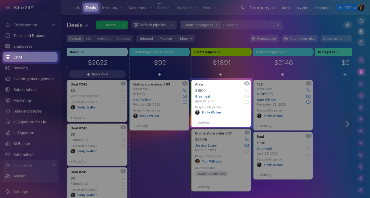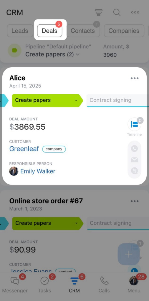 Pour éviter de transférer les données manuellement et de lier les éléments vous-même, Bitrix24 vous permet de créer un élément à partir d’un autre. La nouvelle fiche est alors remplie automatiquement et reste liée à l’élément d’origine. Cela facilite le suivi du client dans l’entonnoir de vente et permet de consulter tout l’historique au même endroit.