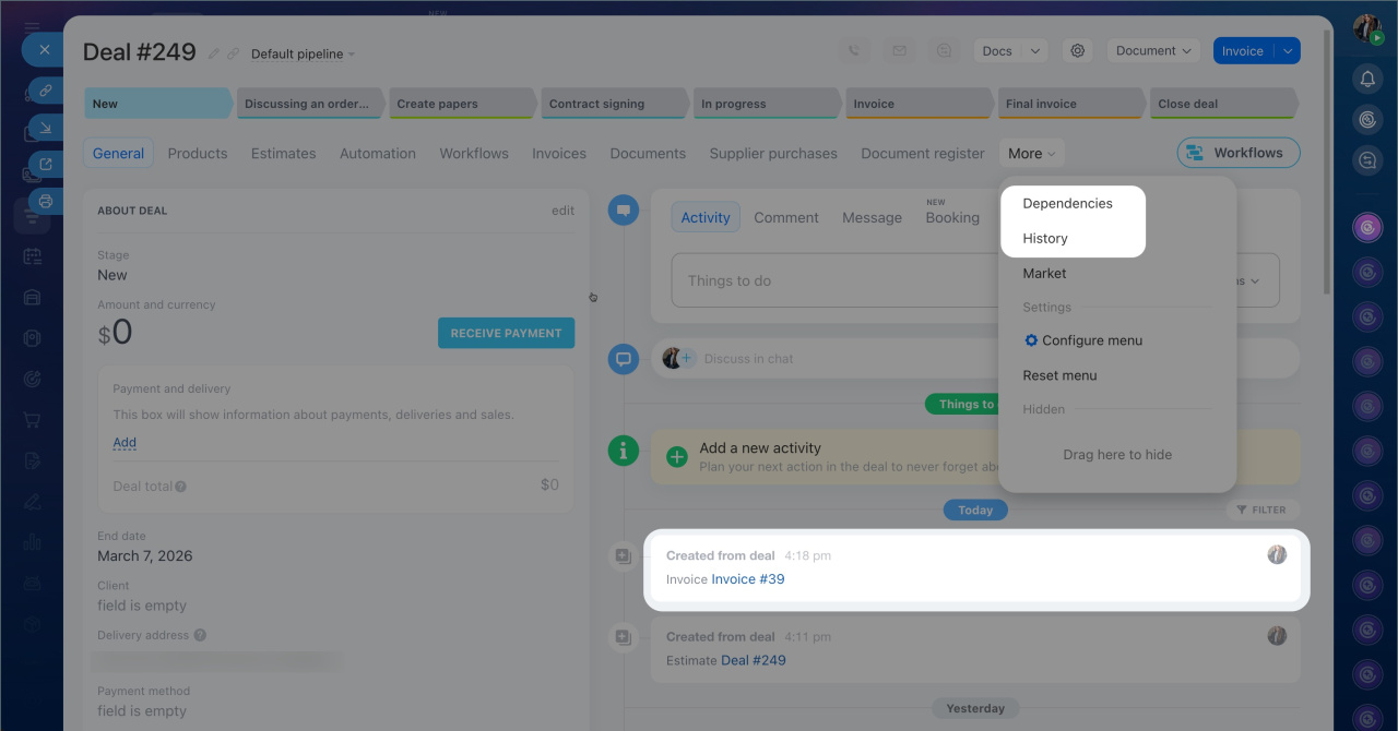 Champs personnalisés dans le CRM - L’élément créé s’affiche dans la fiche de l’élément d’origine : dans la chronologie ainsi que dans les onglets Historique et Dépendances. Pour ouvrir la fiche du nouvel élément, cliquez sur son nom.