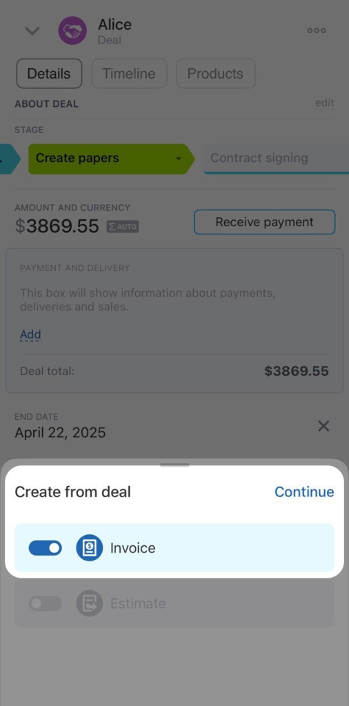 - Sélectionnez Créer > Facture et appuyez sur Continuer. Si l’élément d’origine contient des champs personnalisés qui n’existent pas dans le nouvel élément, il vous sera proposé de les créer. Activez l’interrupteur correspondant si vous souhaitez créer ces champs, puis appuyez sur Continuer. Une facture sera créée à partir de la transaction et sa fiche s’ouvrira.