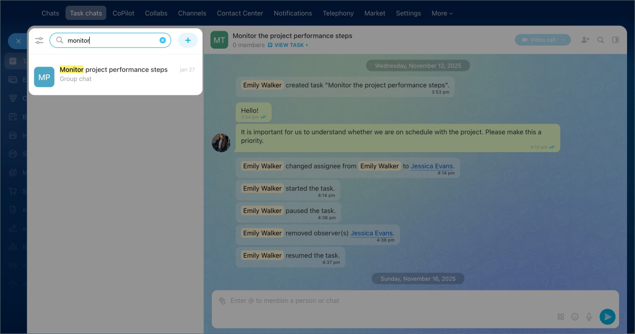 Une recherche par nom de tâche a été ajoutée dans la section Chats de tâches du Messenger. Commencez à saisir le nom pour afficher les discussions correspondantes. Vous retrouvez ainsi plus rapidement les échanges nécessaires et naviguez plus facilement dans les discussions professionnelles.