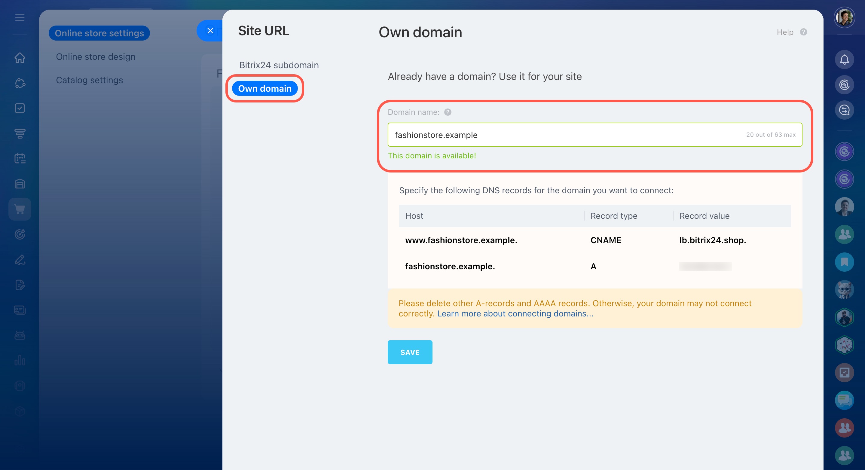 Par défaut, chaque boutique en ligne dans Bitrix24 reçoit une adresse gratuite sur le sous-domaine *.bitrix24.shop. Vous pouvez ainsi lancer rapidement les ventes et tester la boutique sans frais supplémentaires.