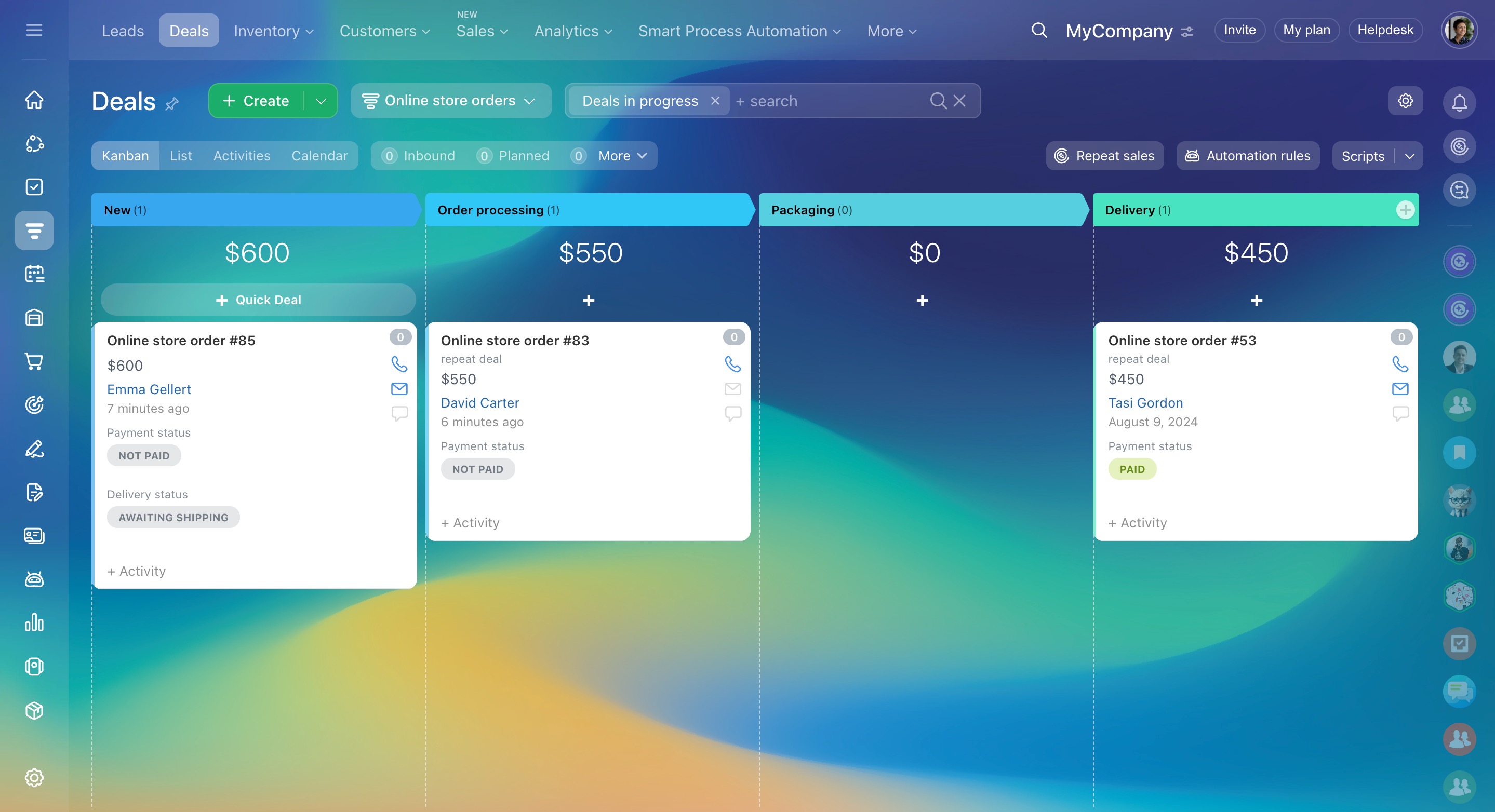 Les commandes arrivent directement dans Bitrix24 et les clients reçoivent des notifications. Les employés gagnent du temps et le risque d’erreurs diminue.