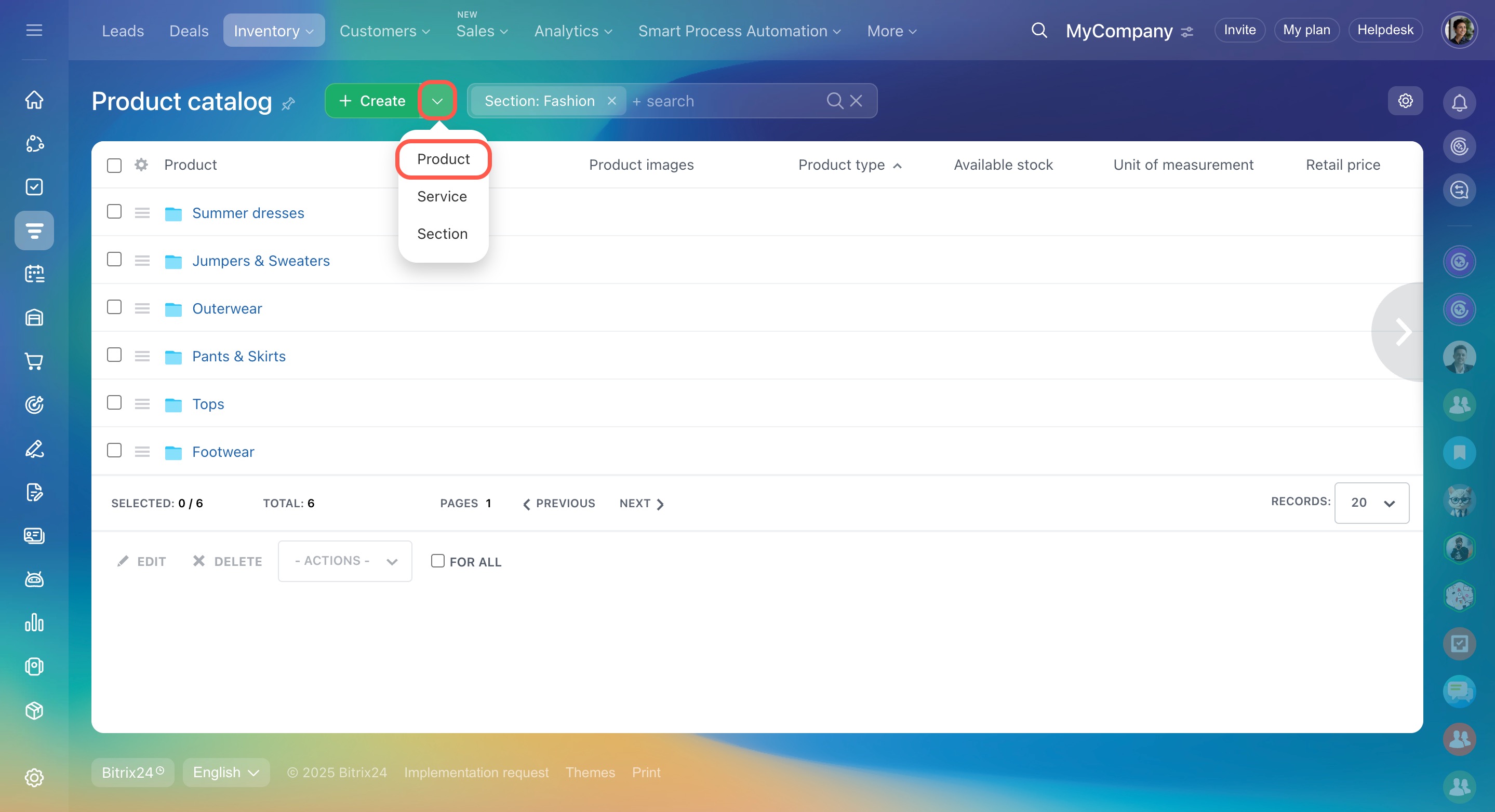 - Dans Bitrix24, le catalogue de produits est commun au CRM et aux boutiques en ligne. Vous pouvez le créer manuellement ou importer un fichier existant si votre assortiment est important.