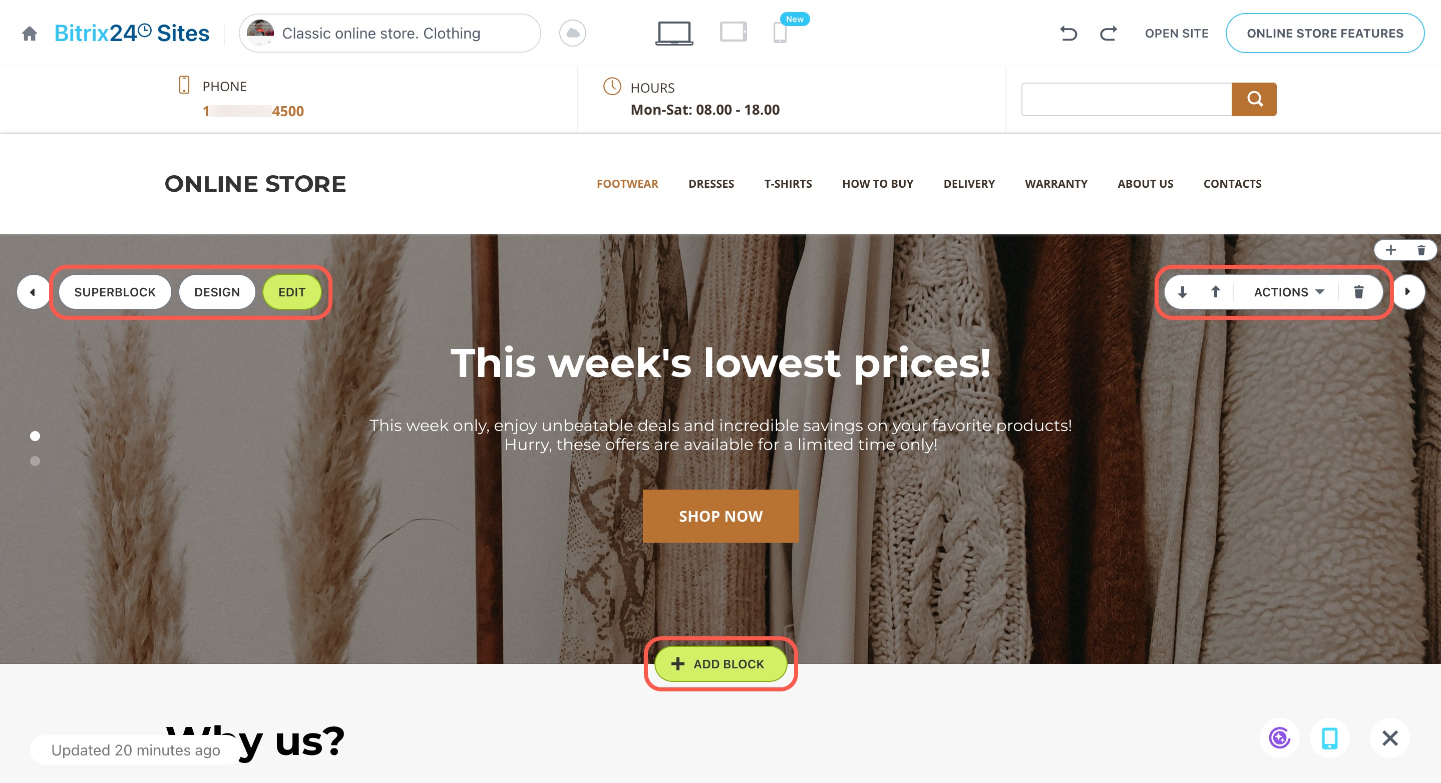 Pour adapter la boutique aux besoins de votre entreprise, vous pouvez modifier les blocs existants, le design et les paramètres du catalogue, par exemple l’affichage des produits et des prix ou la position du panier.