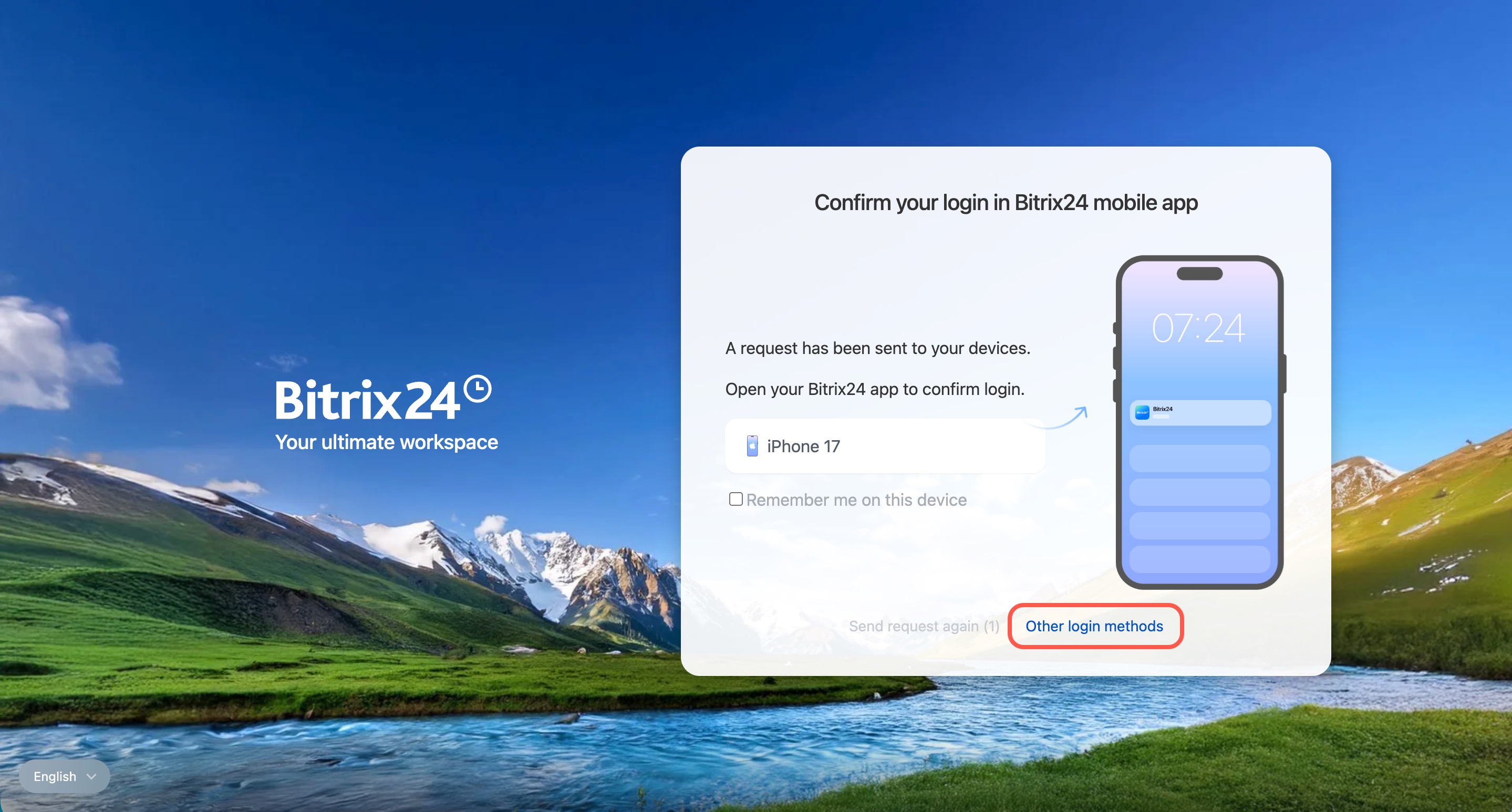 Si vous n'avez pas accès à l'application mobile, lors de la connexion à Bitrix24, cliquez sur Autres méthodes de connexion et choisissez l'option appropriée :