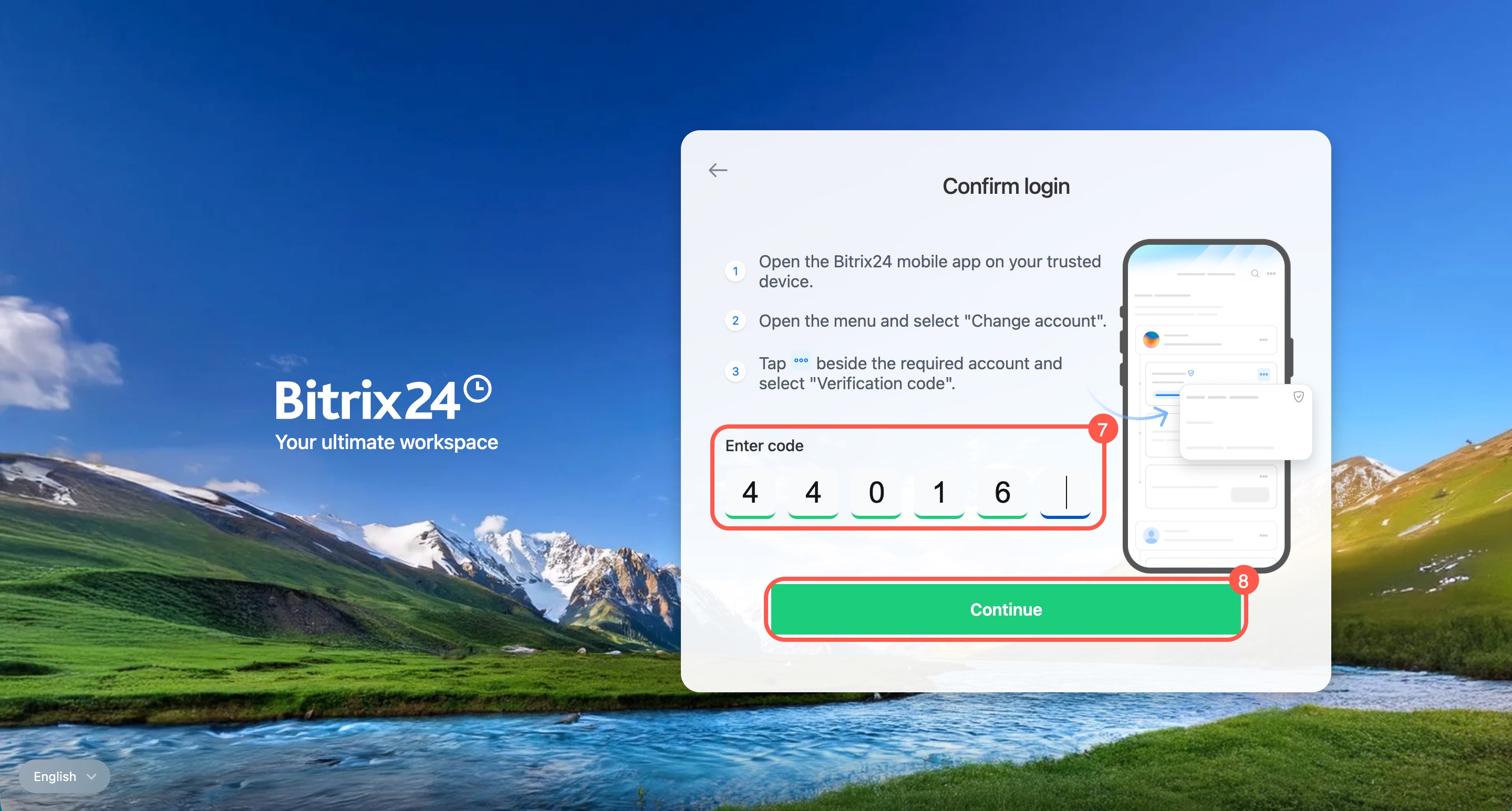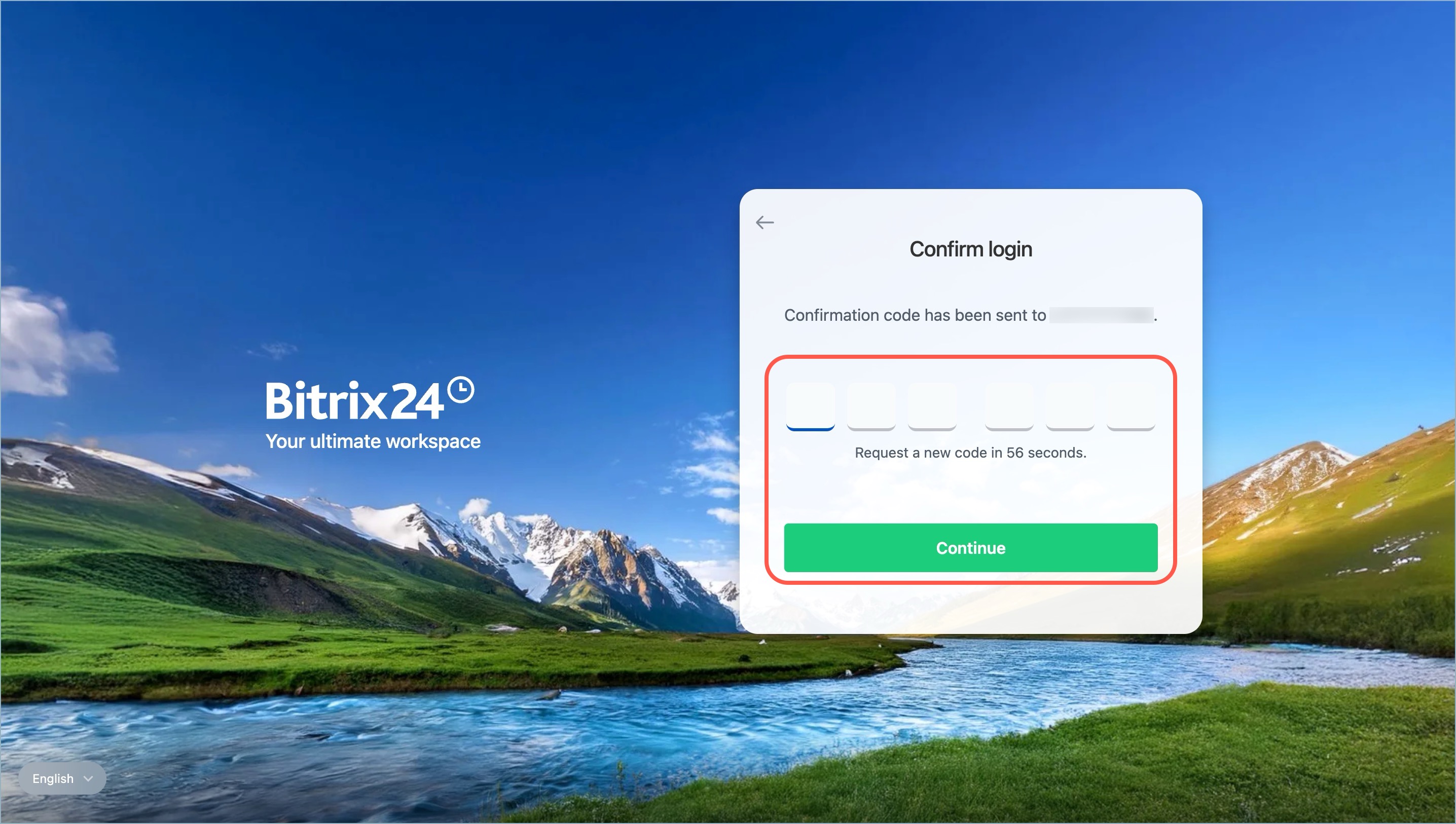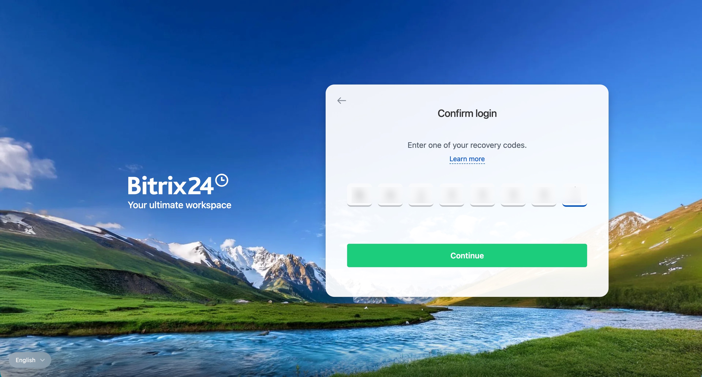 - Saisissez le code dans Bitrix24 sur votre ordinateur et cliquez sur Continuer. Vous serez connecté à Bitrix24.