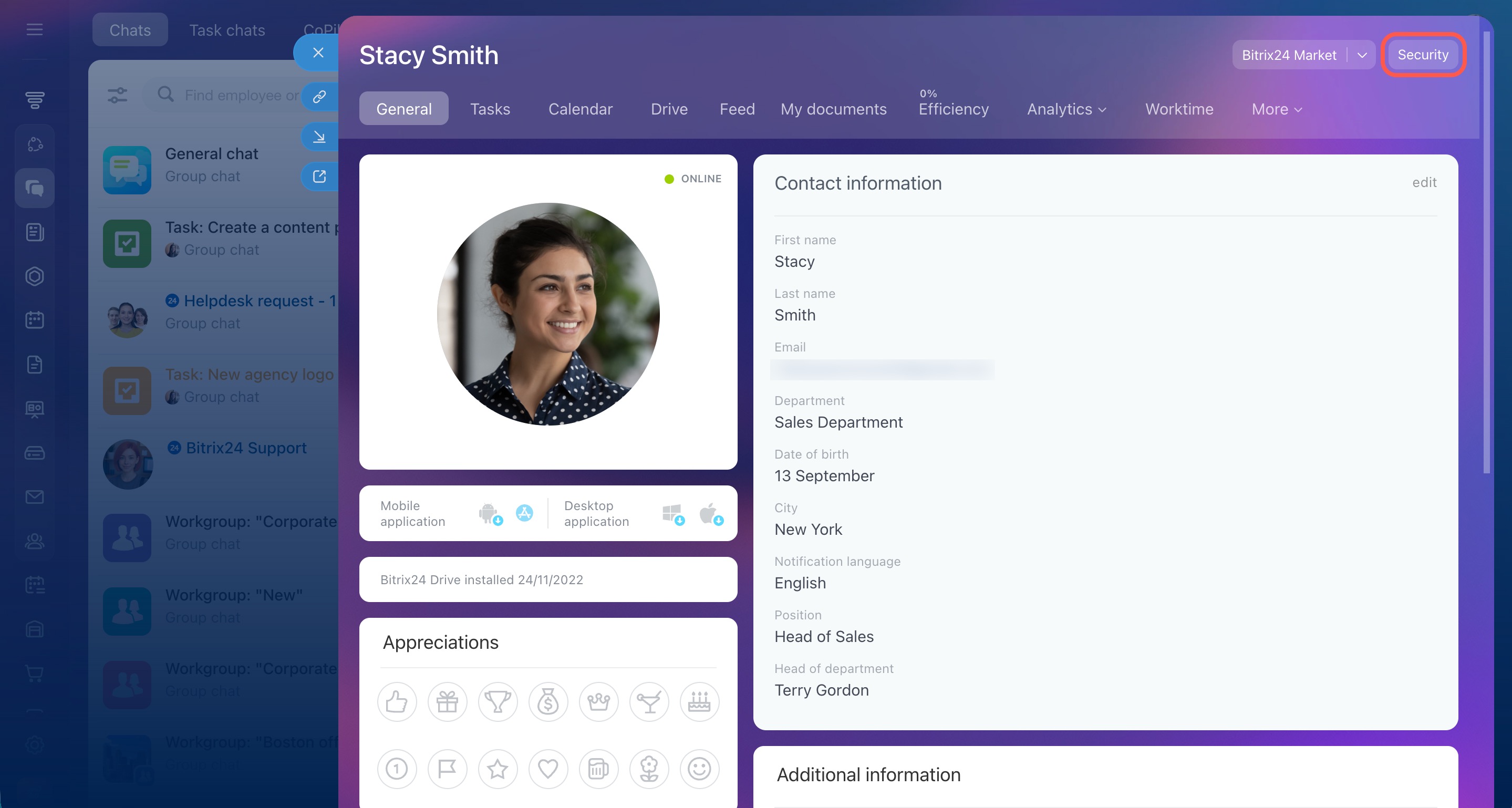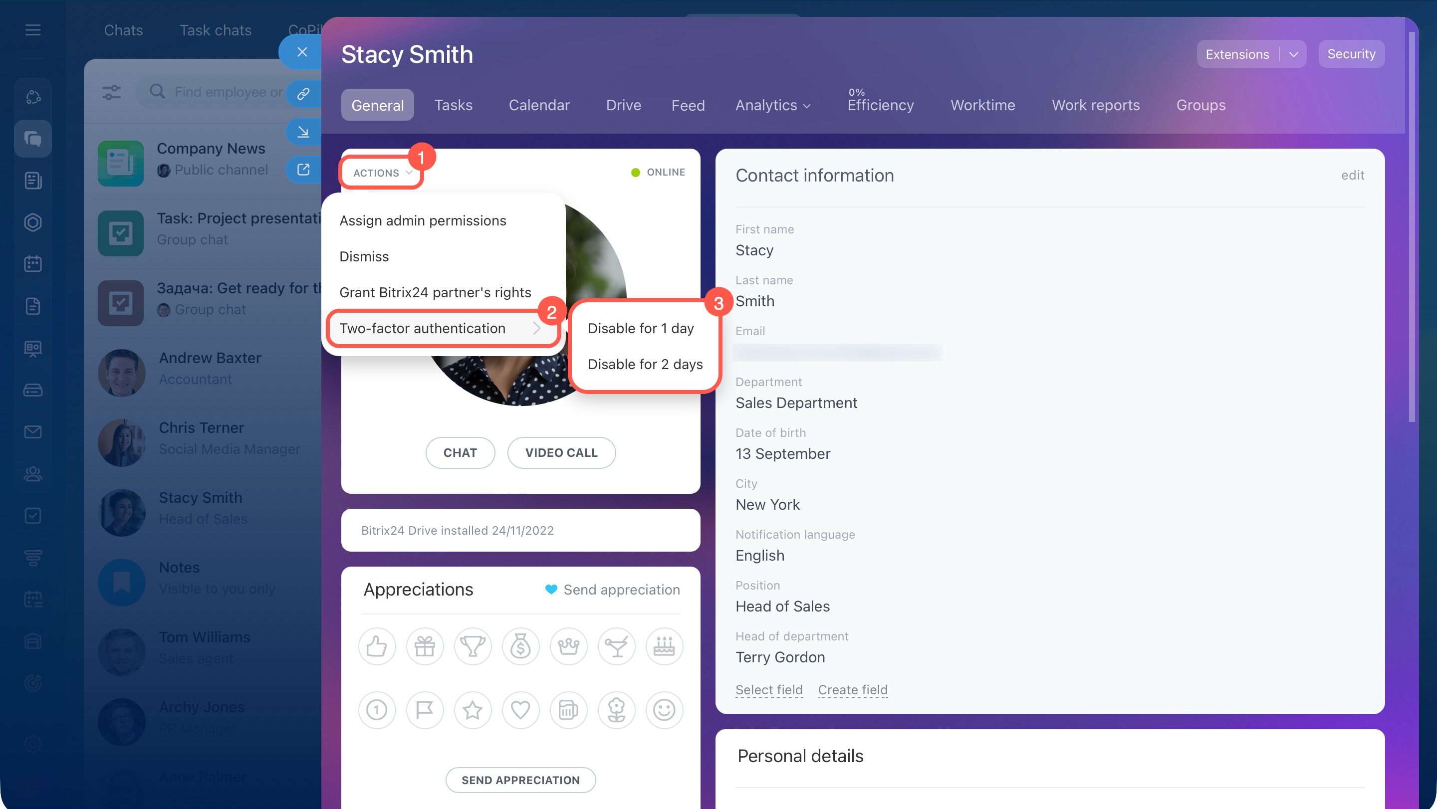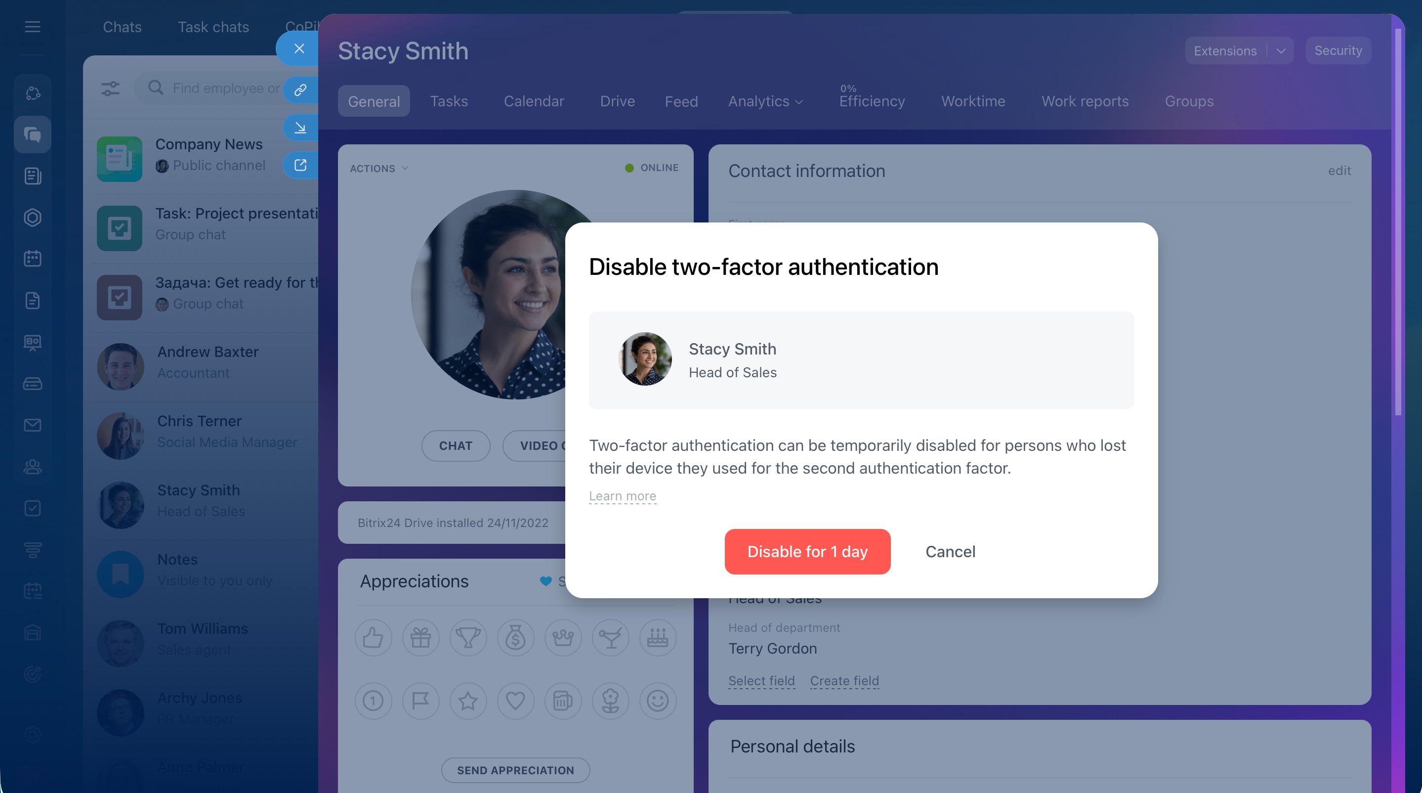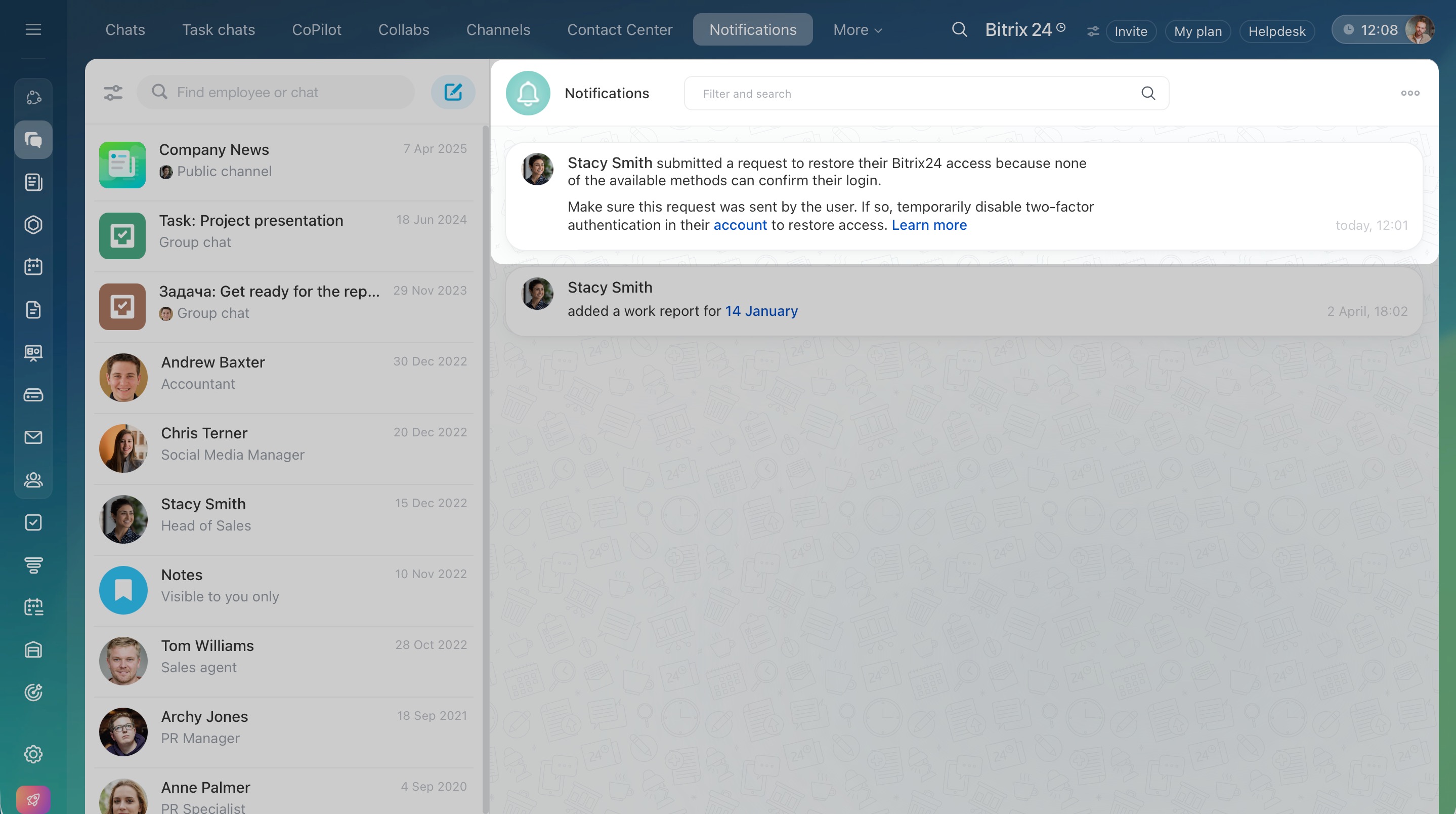 Vous recevrez une notification dans Bitrix24. Assurez-vous que la demande provient bien de cet employé : contactez-le par un moyen disponible pour confirmer son identité.