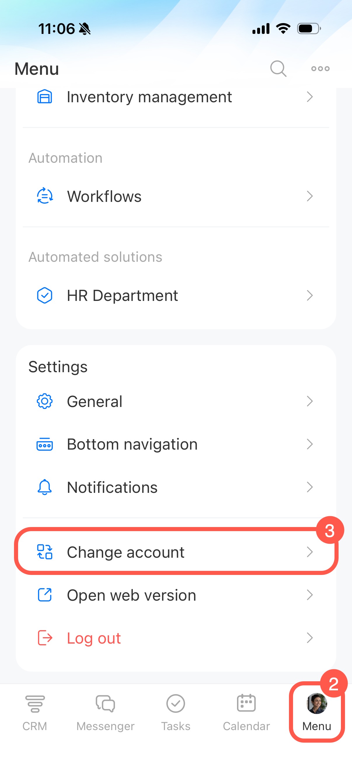 - Ouvrez l’application mobile Bitrix24 sur un appareil de confiance. Accédez à Menu > Changer de compte.
