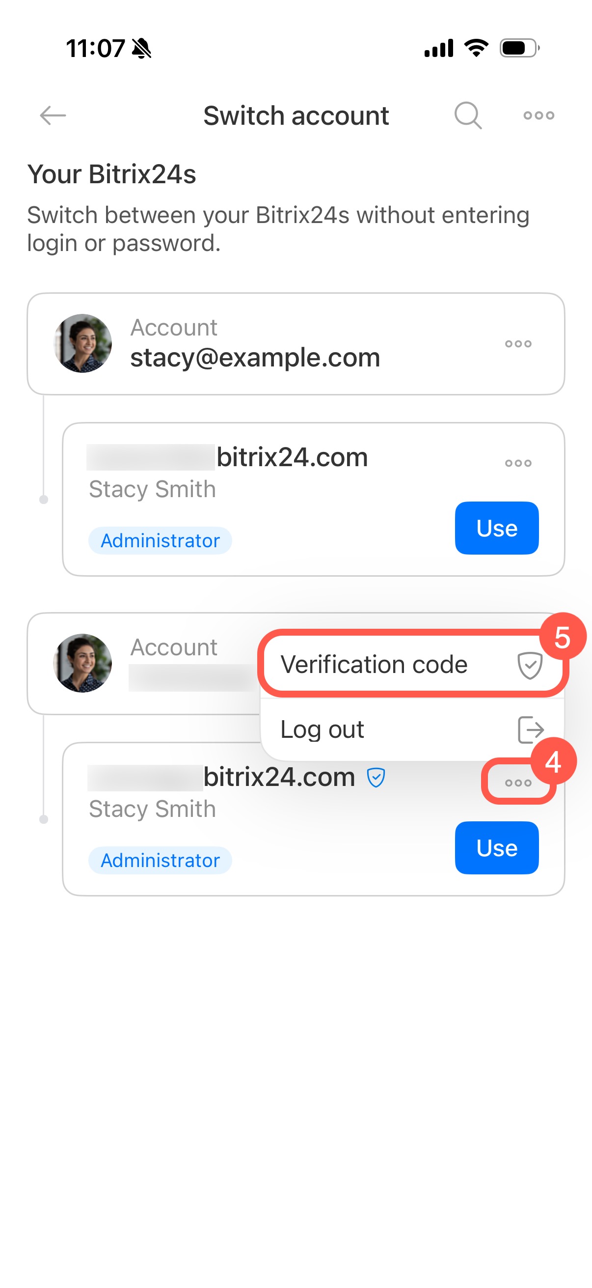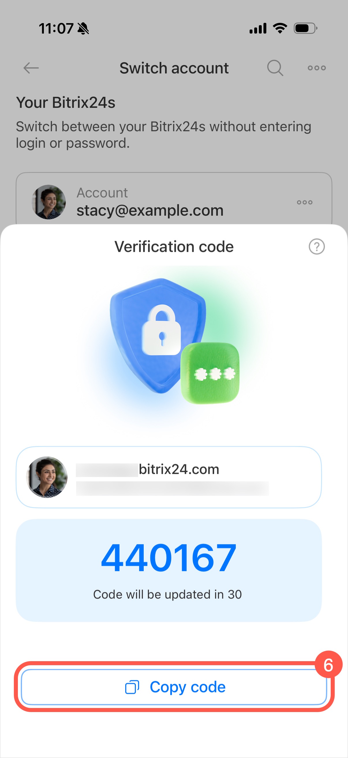 - Cliquez sur Code de vérification. Bitrix24 génère un code et l’envoie à l’application mobile.