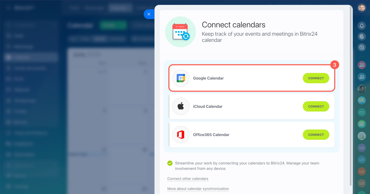 Il est parfois très difficile d'utiliser plusieurs calendriers en même temps dans différents services - il faut constamment vérifier avec chacun d'eux. Synchronisez votre calendrier Google avec Bitrix24 ! Tous vos événements seront toujours à portée de main - dans le calendrier de votre téléphone, dans Bitrix24 et dans Google.