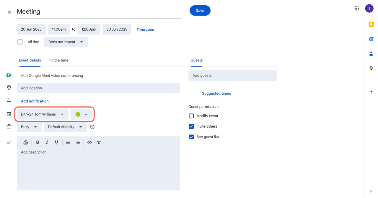 Lors de la création d'un événement dans le calendrier Google, il vous suffit de sélectionner le calendrier de l'employé Bitrix24 :