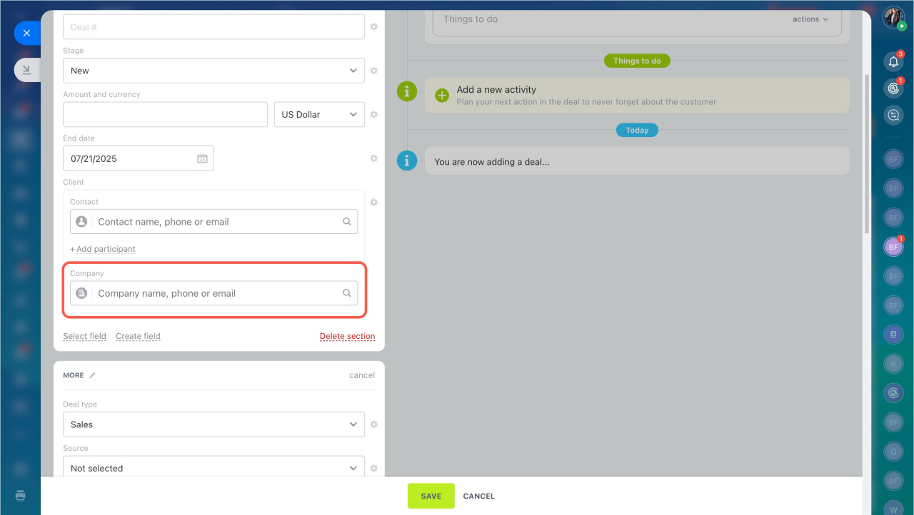 Dans le formulaire de contact, il y a un champ Sociétés du contact où vous pouvez sélectionner une entreprise existante ou en créer une nouvelle. Vous pouvez également sélectionner ou créer plusieurs entreprises dans ce champ.