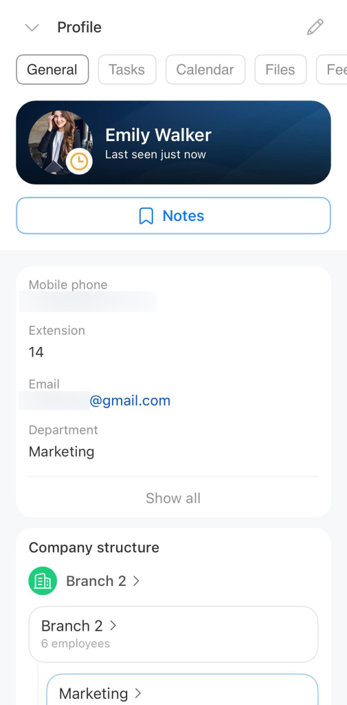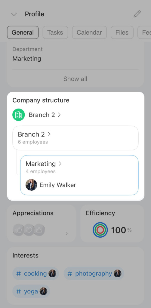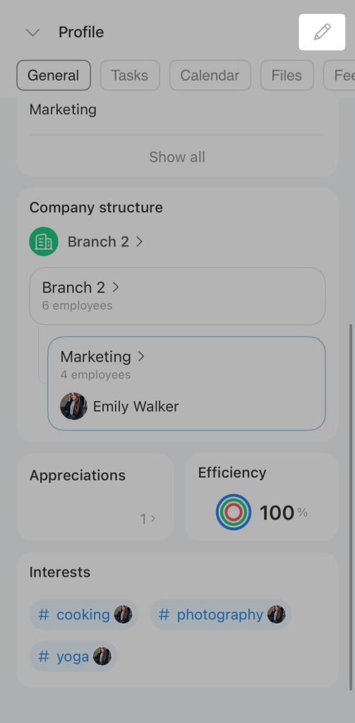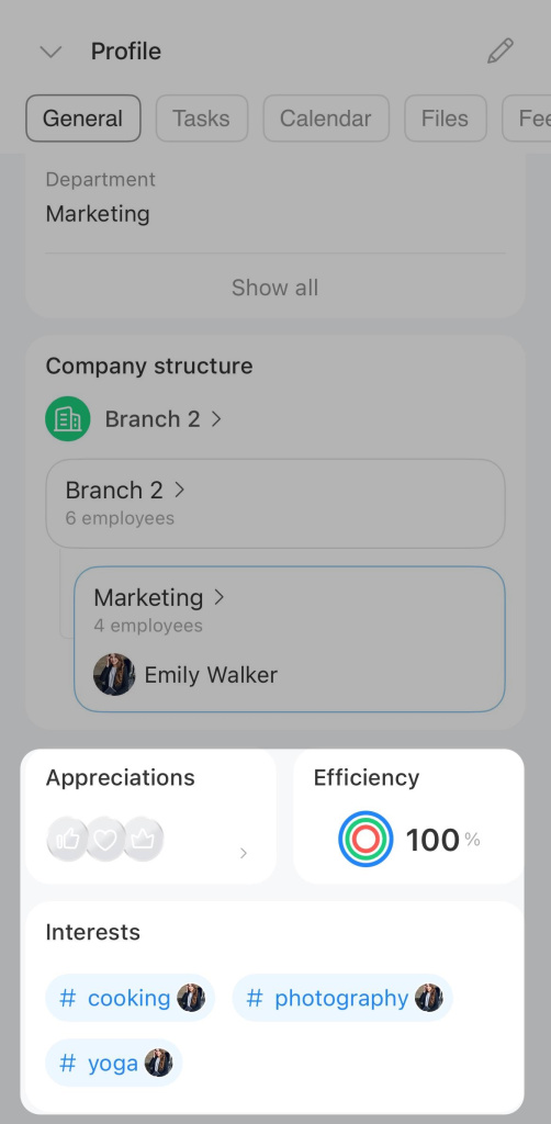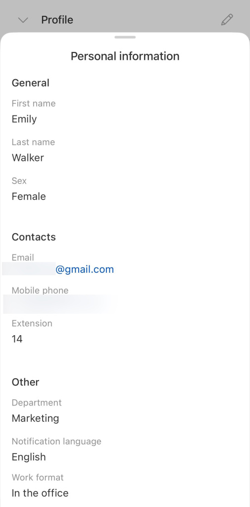 Le profil des employés est désormais plus intuitif. Il est plus facile de consulter les informations de vos collègues, comme leurs coordonnées, leur poste, leur département, etc. Vous pouvez également mettre à jour vos propres informations en quelques clics.