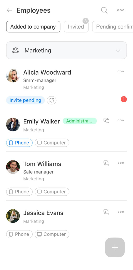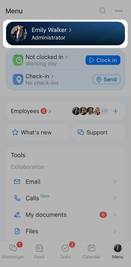 Rôle de l'employé. Une icône dans le profil indique le rôle de l'employé dans l'entreprise : Invité, Partenaire, Administrateur. Par exemple, un administrateur peut gérer les droits d'accès, configurer les processus métier et d'autres outils.