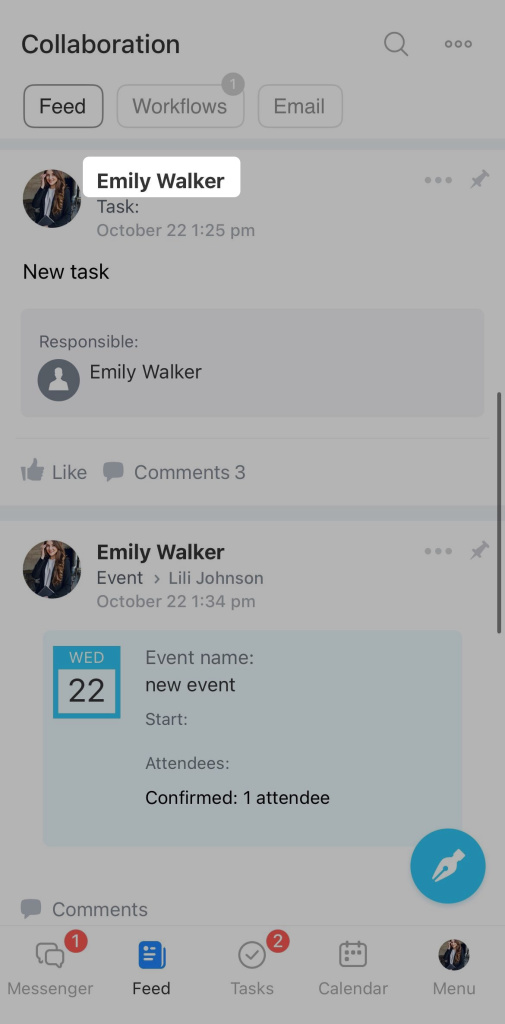 Pour accéder au profil d'un employé, cliquez sur son nom dans le chat, le fil d'actualité ou tout autre outil Bitrix24.