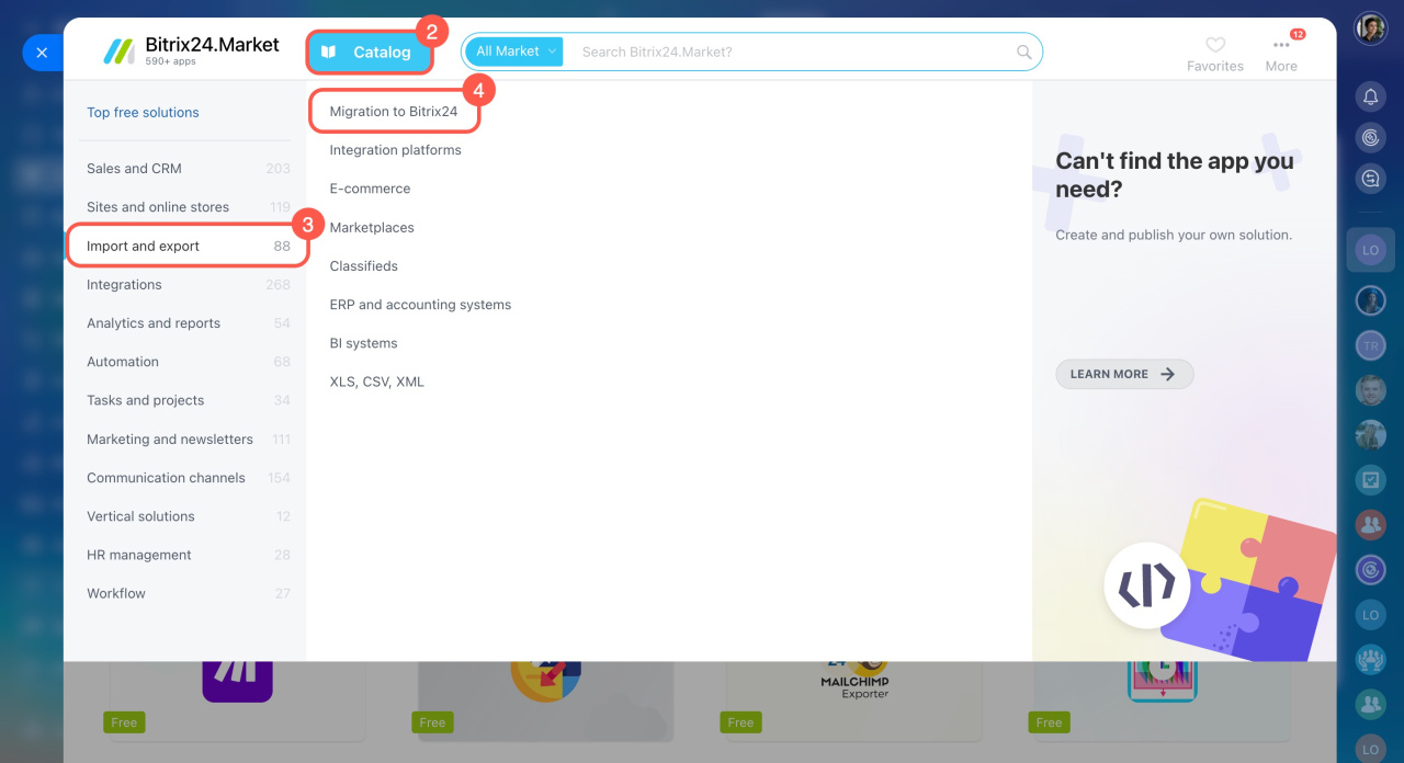 Vous pouvez également trouver les applications dans votre compte dans la section CRM - Paramètres - Paramètres CRM - Bitrix24 Market - Migrer depuis un autre CRM :